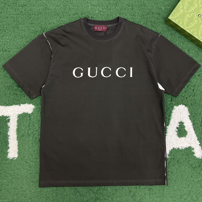 - 구찌 브랜드의 로고가 디자인된 남녀 공용 반팔 티셔츠입니다.