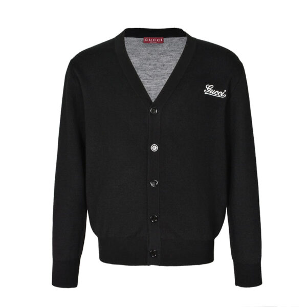 - 구찌 브랜드의 여성용 가디건으로, V넥 디자인과 로고 자수가 특징입니다.