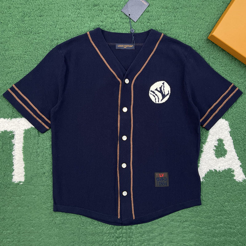 - 이 제품은 베이스볼 디자인의 쇼트 슬리브드 니트 셔츠입니다.