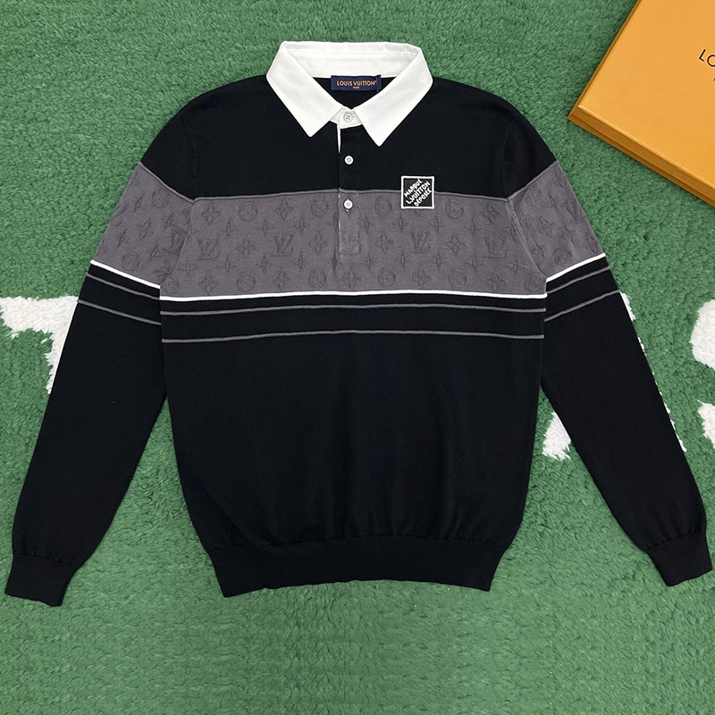 - 루이비통 브랜드의 모노그램 자카드 원단을 사용한 롱 슬리브드 폴로 셔츠입니다.