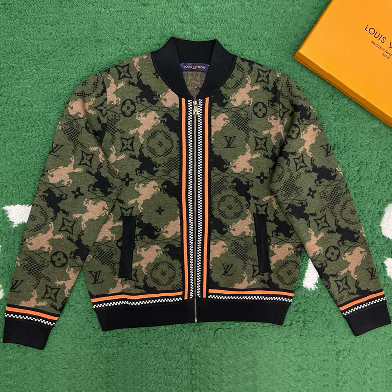 루이비통 모노그램 자카드 보머 블루종은 아우터로 착용하는 제품입니다. 디자인은 잔디집 패턴을 포함하여 구성되어 있습니다.