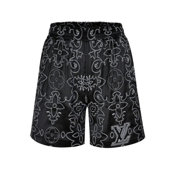 루이비통의 모노그램 프린트가 돋보이는 실크 소재 반바지입니다. 여름철 편안하게 착용하기 좋습니다.