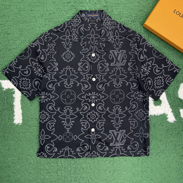 - 루이비통 브랜드의 반팔 셔츠로, LV 아라베스크 패턴이 프린트된 디자인입니다.