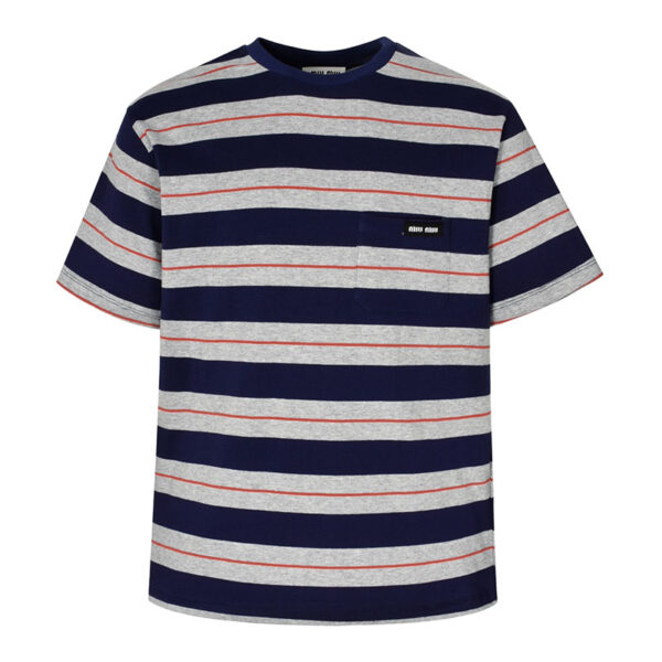 - 미우미우 브랜드의 스트라이프 패턴 반팔 저지 티셔츠입니다.