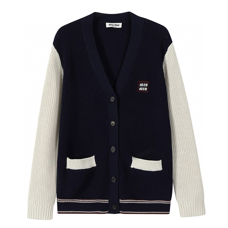 - 미우미우 로고 패치 캐시미어 가디건은 따뜻한 착용감과 고급스러운 캐시미어 소재로 제작된 여성용 상의입니다.