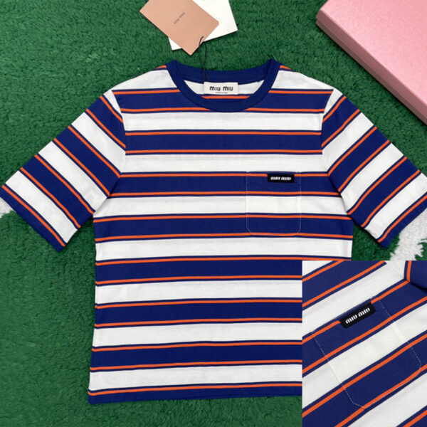 - 미우미우 로고 패치가 부착된 스트라이프 코튼 반팔 티셔츠입니다.