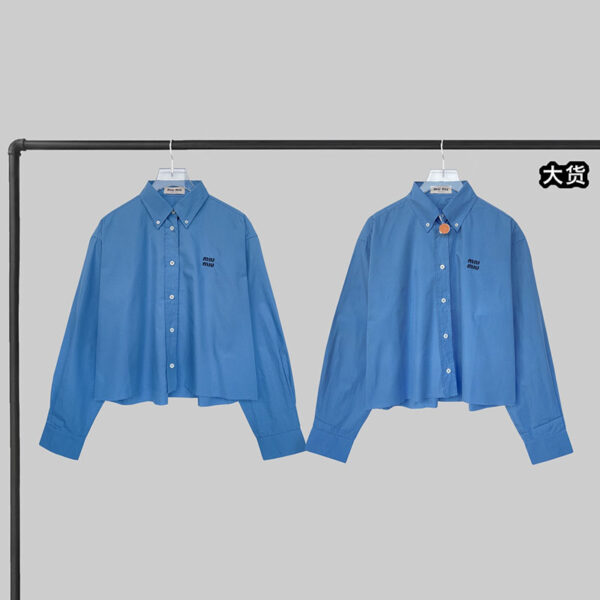 미우미우 브랜드의 로고 셔츠로 제작된 상의입니다. 깔끔한 디자인과 포플린 원단이 특징인 셔츠입니다.