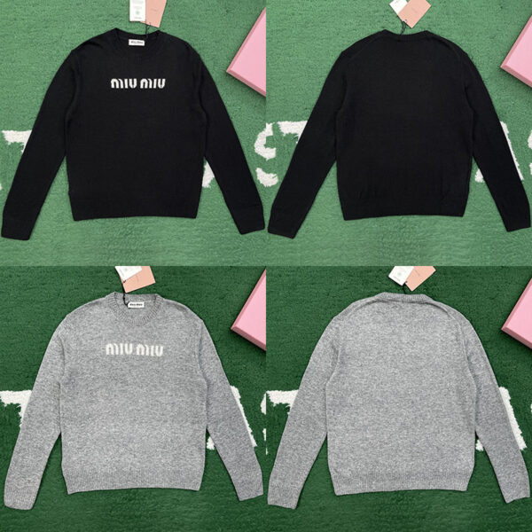 - 가슴 부분에 미우미우 로고가 위치한 디자인입니다.