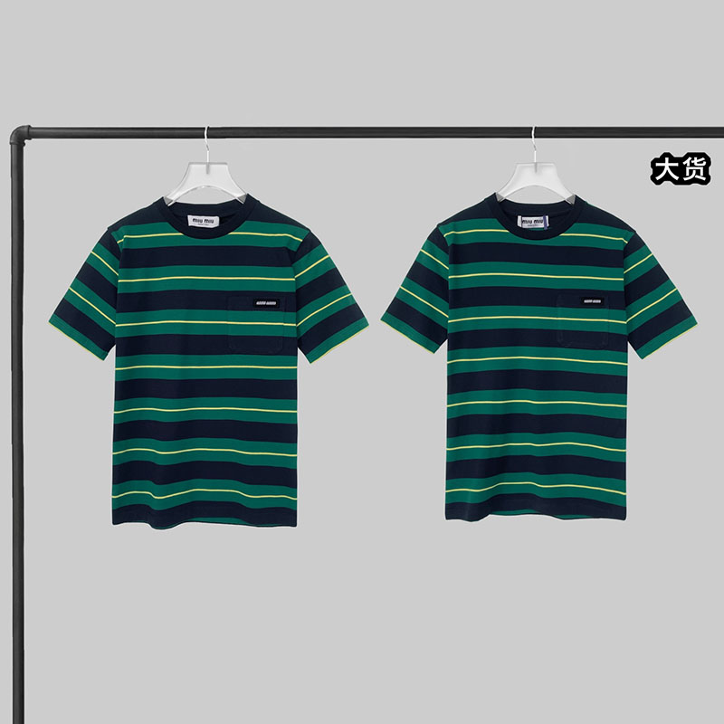 - 미우미우 브랜드의 스트라이프 패턴 반팔 티셔츠입니다.