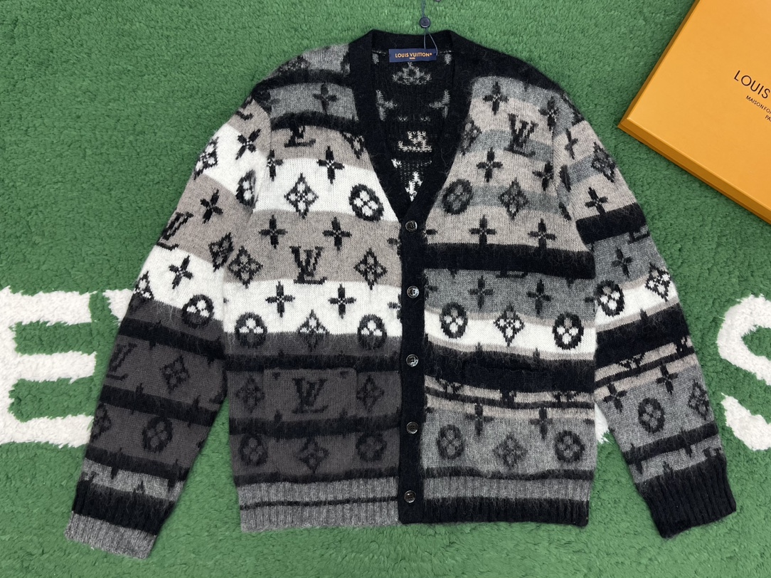 - 이 제품은 루이비통 브랜드의 모노그램 무늬가 있는 모헤어 소재 가디건입니다.