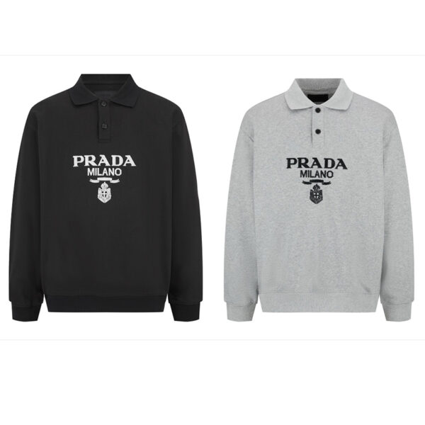 프라다 자카드 니트 로고 폴로 셔츠입니다. 세련된 디자인과 니트 소재 구조가 특징입니다.