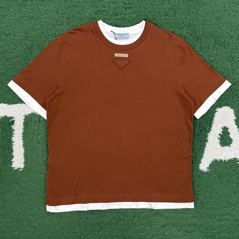 - 프라다의 여성용 반팔 티셔츠로, 레이어드 디자인이 특징입니다.