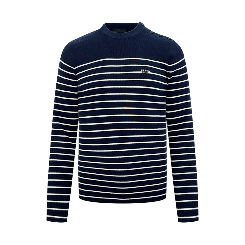 - 프라다 브랜드의 스트라이프 패턴이 돋보이는 숄더 버튼 스웨터입니다.