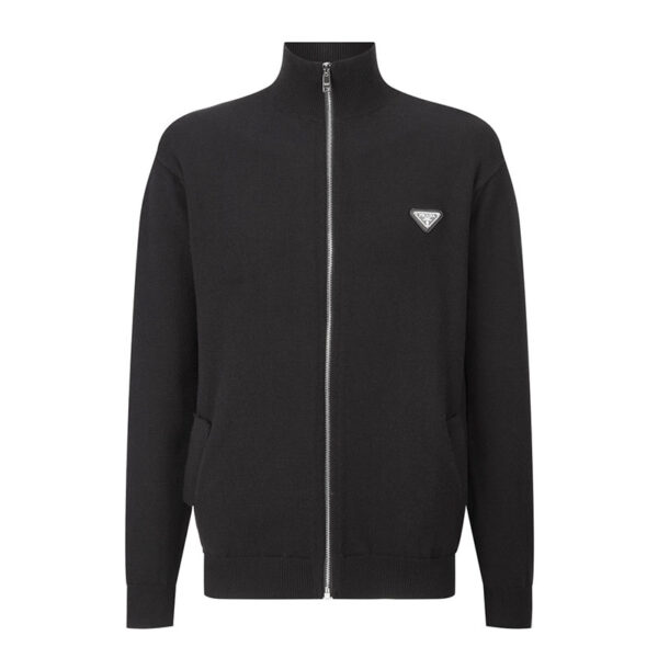 프라다의 트라이앵글 로고가 돋보이는 니일론 터틀넥 집업입니다. 간편한 집업 디자인으로 실용적인 착용이 가능합니다.