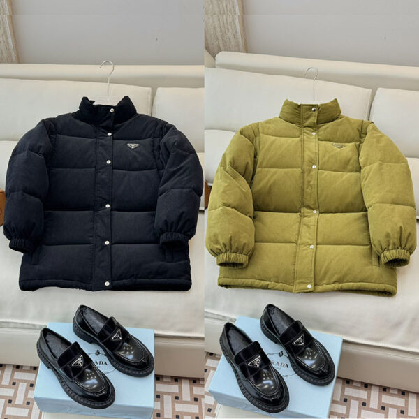 - 프라다 트라이앵글 로고가 특징인 패딩 코듀로이 아우터입니다.
