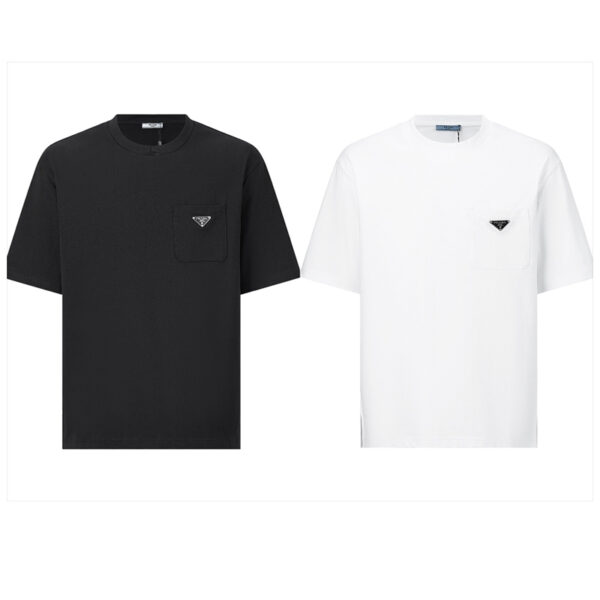 프라다의 트라이앵글 로고가 포인트인 코튼 반팔 티셔츠입니다. 편안한 일상복으로 활용하기 좋은 아이템입니다.
