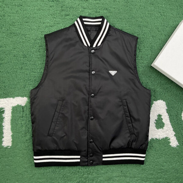 프라다의 트라이앵글 로고가 적용된 나일론 베스트입니다. 아우터 레이어로 활용 가능한 아이템입니다.