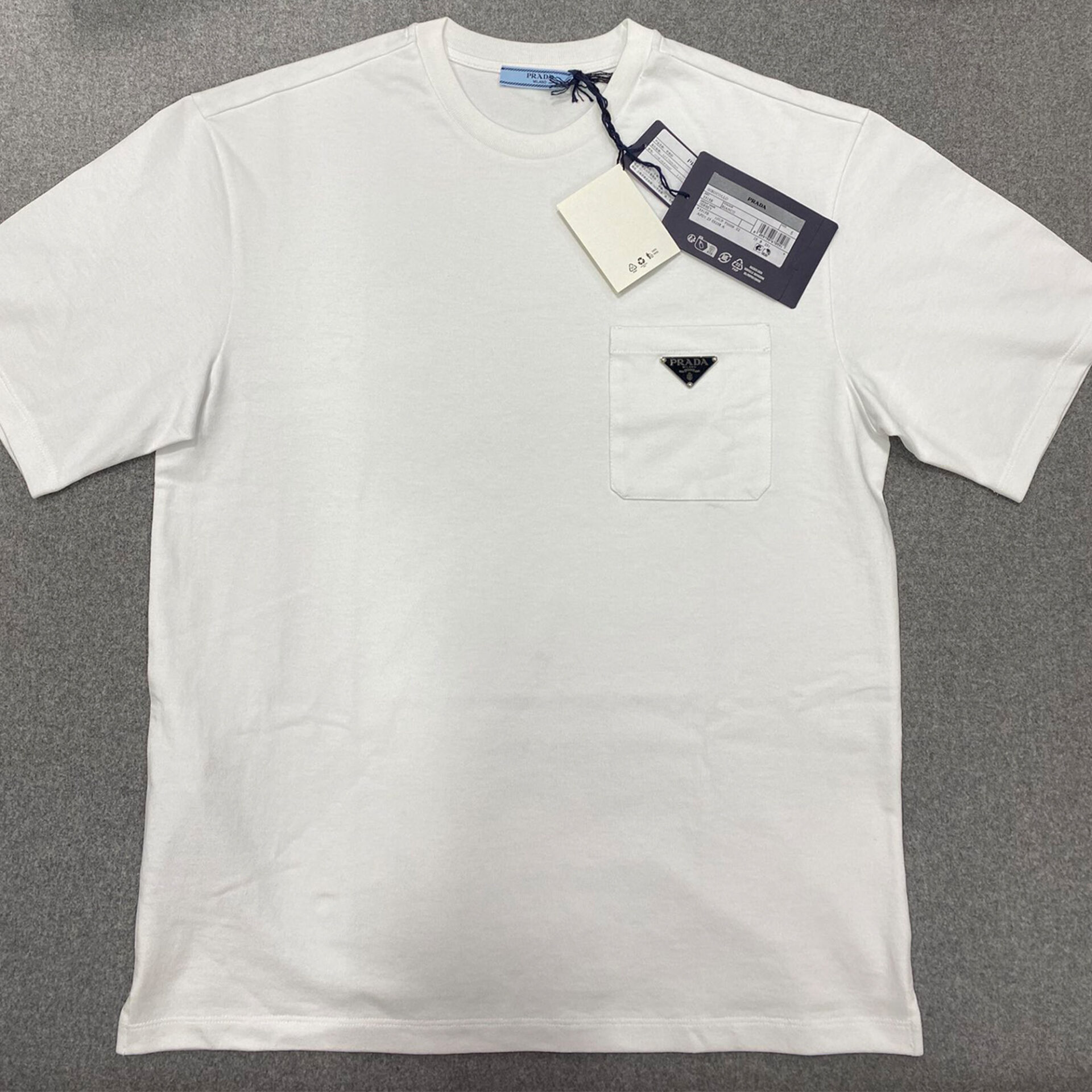 - 프라다 브랜드의 트라이앵글 포켓 디자인이 적용된 반팔 티셔츠입니다.