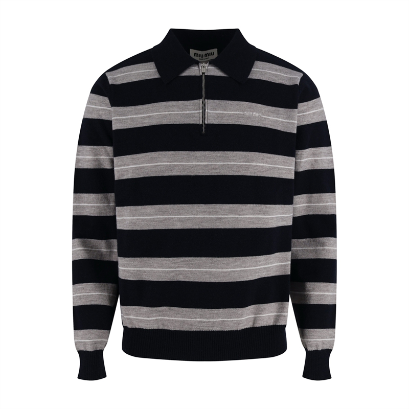 미우미우 스트라이프 하프 집업 폴로 셔츠입니다. 편안한 착용감의 하프 집업 디자인입니다.