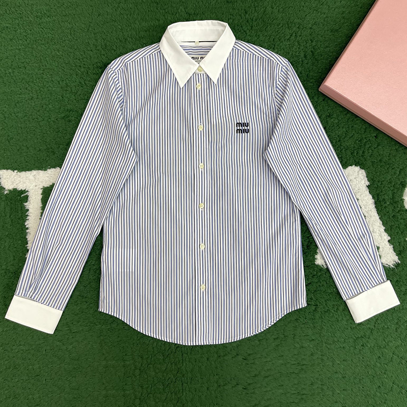 - 미우미우의 스트라이프 패턴이 특징인 로고 자수 셔츠입니다.