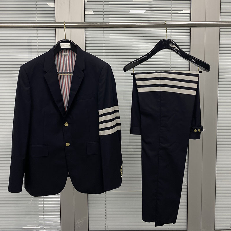 - 톰브라운 브랜드의 클래식한 블레이저와 팬츠 세트로, 일상과 격식 있는 자리 모두 활용할 수 있는 제품입니다.
